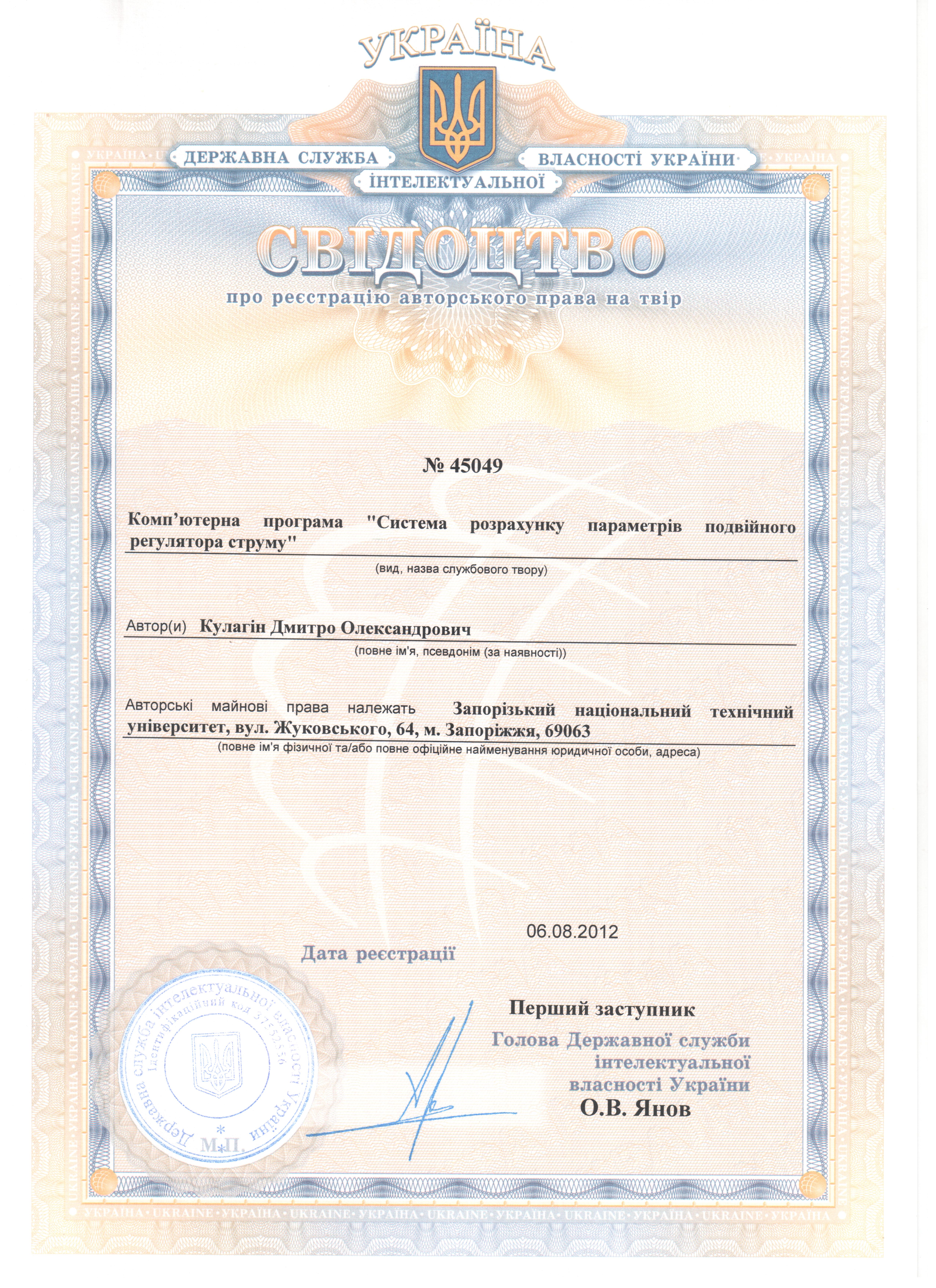 Свідоцтво про реєстрацію авторського права на твір № 45049 від 06.08.2012 «Комп’ютерна програма «Система розрахунку параметрів подвійного регулятора струму» / Кулагін Д. О. – Авторські та майнові права належать Запорізькому національному технічному університету
