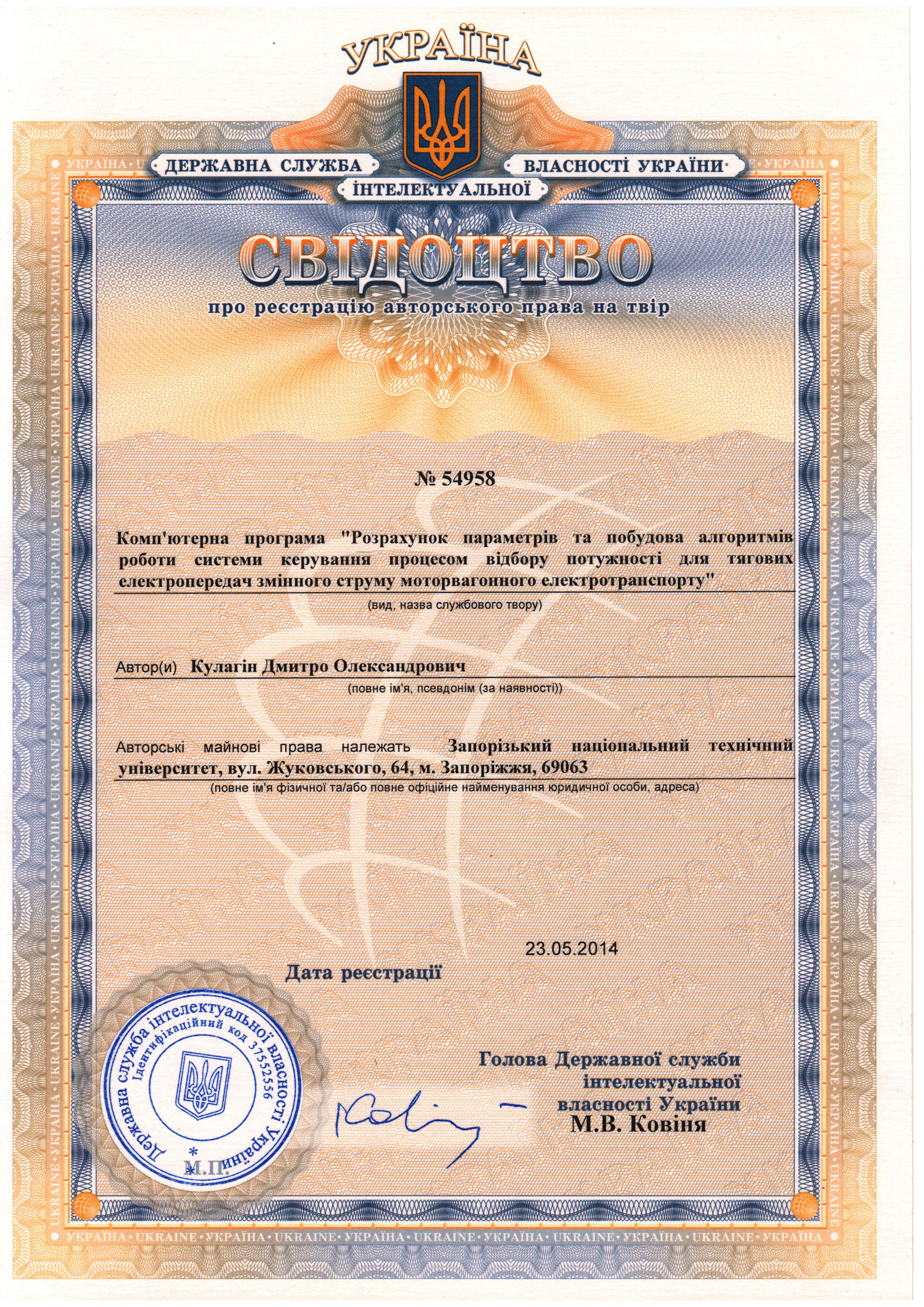 Свідоцтво про реєстрацію авторського права на твір № 54958 від 23.05.2014 «Комп’ютерна програма «Розрахунок параметрів та побудова алгоритмів роботи системи керування процесом відбору потужності для тягових електропередач змінного струму моторвагонного електротранспорту» / Кулагін Д. О. – Заявник та власник Запорізький національний технічний університет
