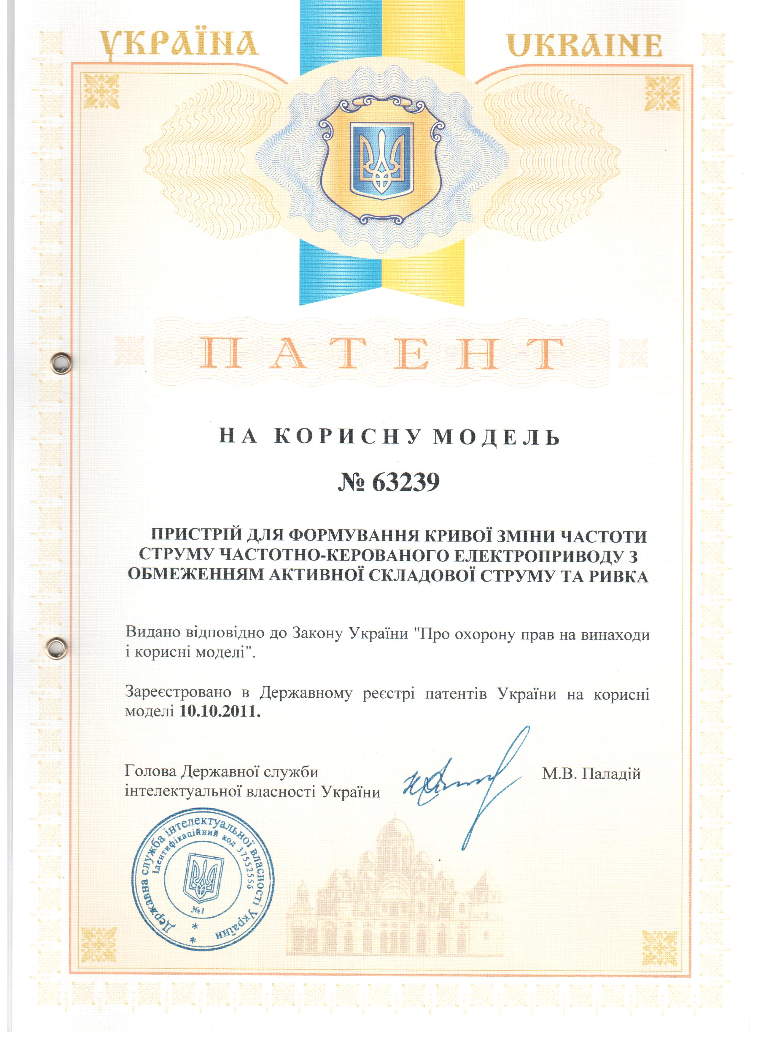 Патент на корисну модель № 63239 (Україна), МПК (2011.01) H02P7/00. Пристрій для формування кривої зміни частоти струму частотно-керованого електроприводу з обмеженням активної складової струму та ривка / Кулагін Д. О., Качур О. С., Андрієнко П. Д.; Заявник та патентовласник Запорізький національний технічний університет. – u201013488; заявл. 15.11.2010; опубл. 10.10.2011, Бюл. №19., 2011. – 5 с.