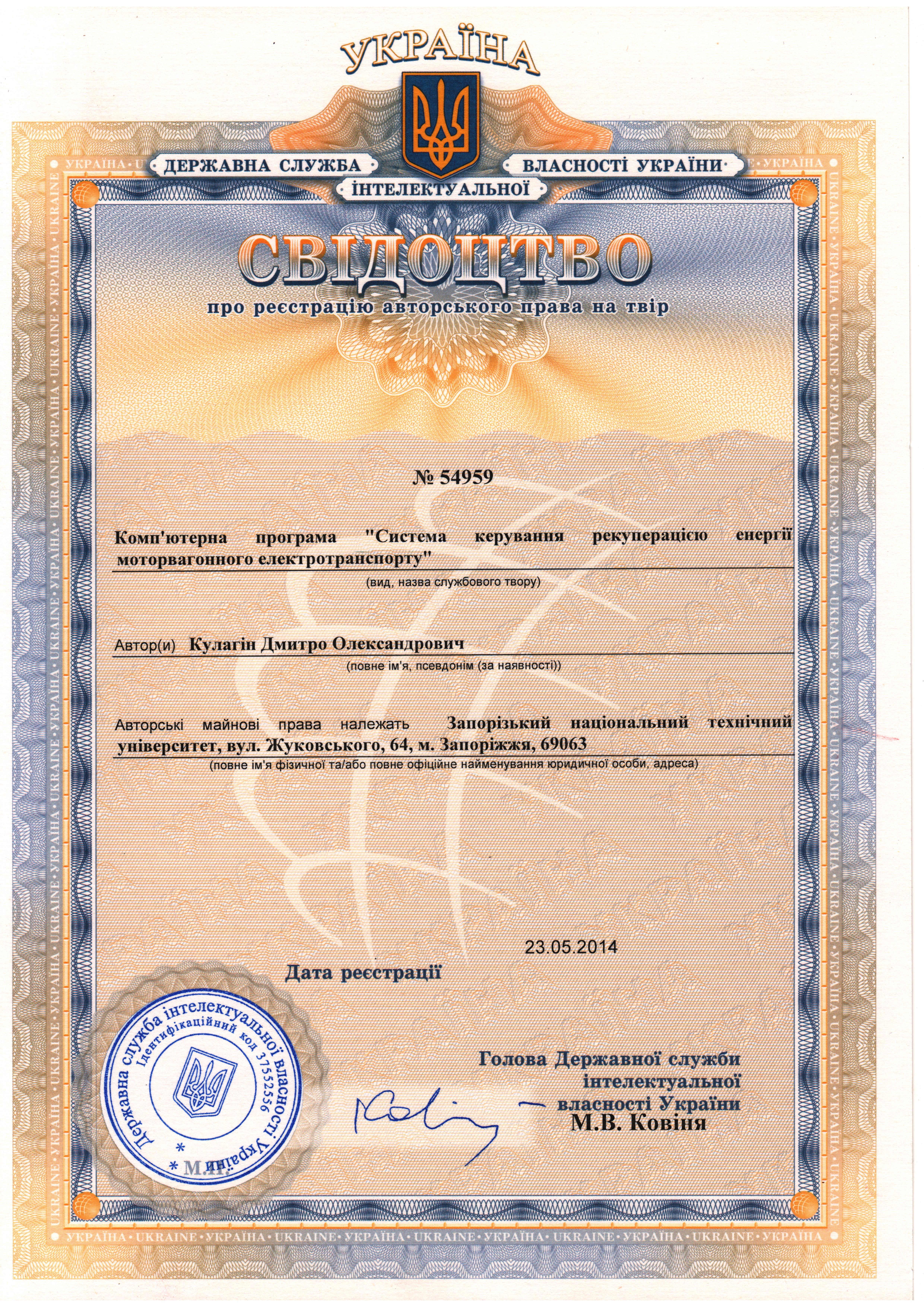 | dc.description | Свідоцтво про реєстрацію авторського права на твір № 54959 від 23.05.2014 «Комп’ютерна програма «Система керування рекуперацією енергії моторвагонного електротранспорту» / Кулагін Д. О. – Заявник та власник Запорізький національний технічний університет | uk |
