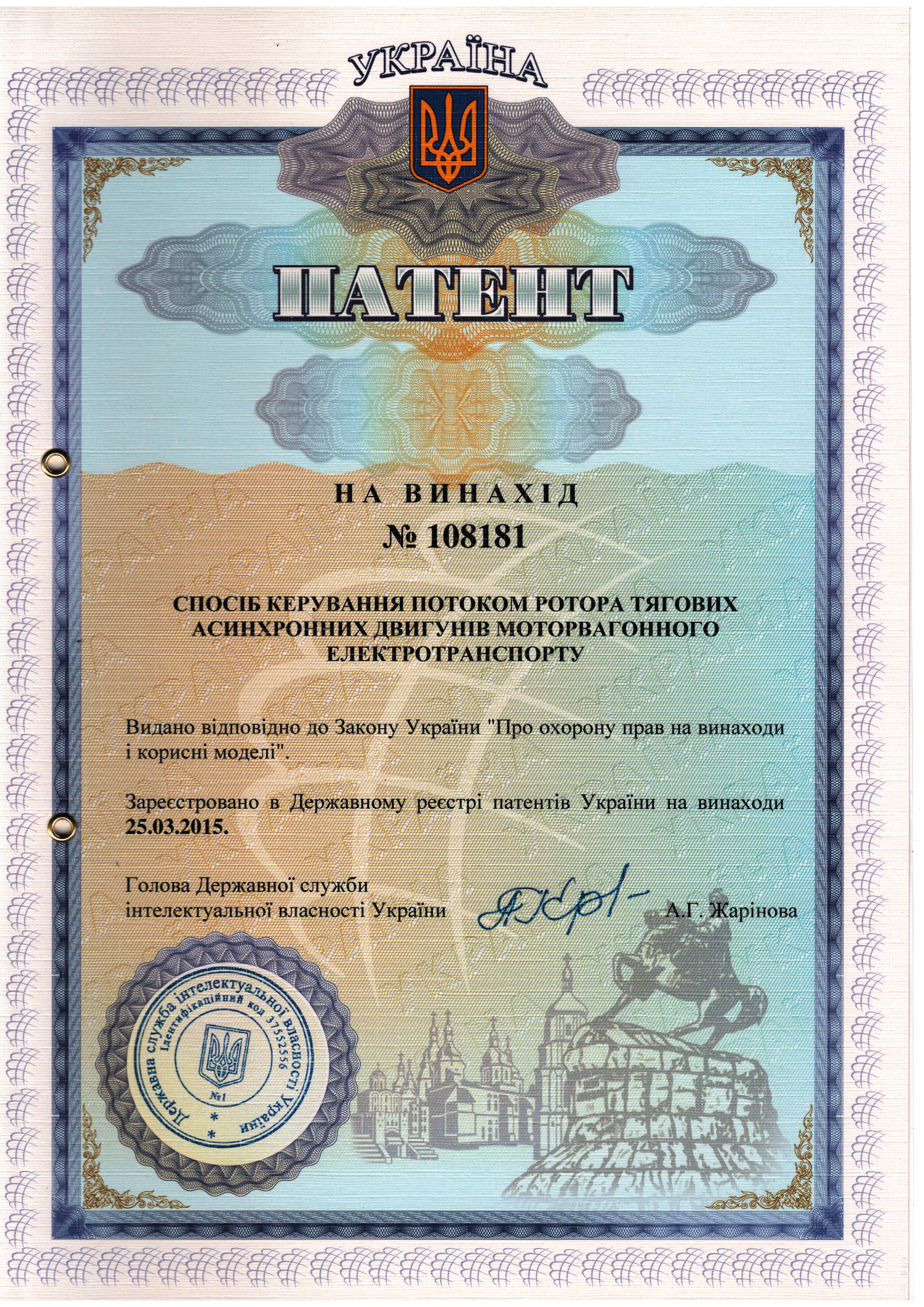 Патент на винахід № 108181 (Україна), МПК (2015.01) Н02Р 27/04 (2006.01), Н02Р 27/00. Спосіб керування потоком ротора тягових асинхронних двигунів моторвагонного електротранспорту / Кулагін Д. О. Заявник та патентовласник Запорізький національний технічний університет. – a201403539; – 2014 р. заявл. 07.04.2014; опубл. 25.03.2015, Бюл. №20 – 2015 р. – 4 с.