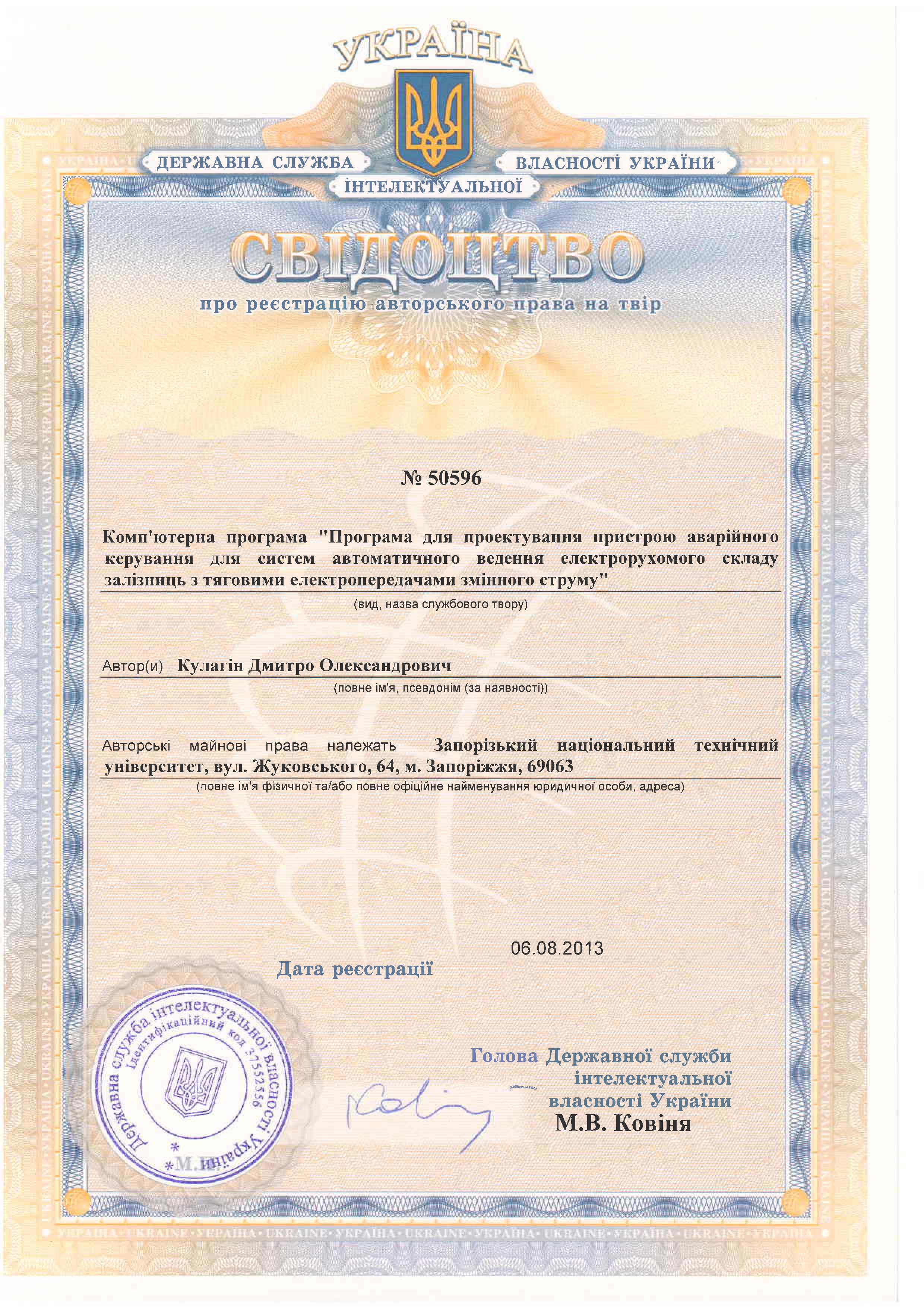 Свідоцтво про реєстрацію авторського права на твір № 50596 від 06.08.2013 «Комп’ютерна програма «Програма для проектування пристрою аварійного керування для систем автоматичного ведення електрорухомого складу залізниць з тяговими електропередачами змінного струму» / Кулагін Д. О. – Авторські та майнові права належать Запорізькому національному технічному університету